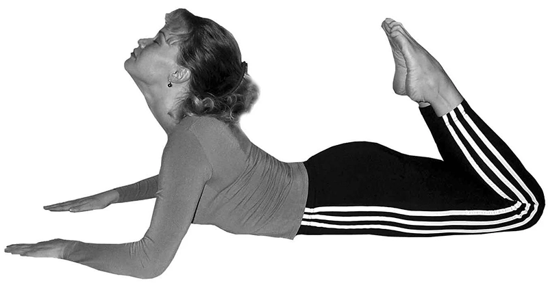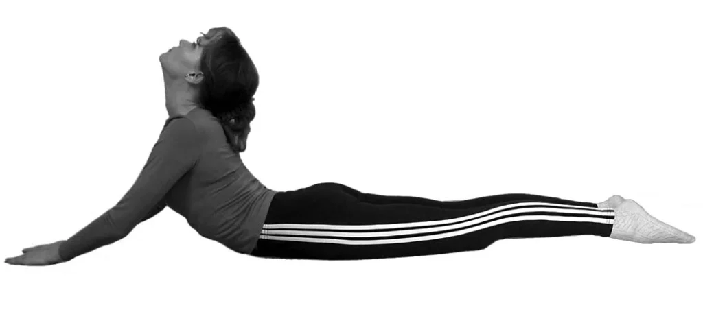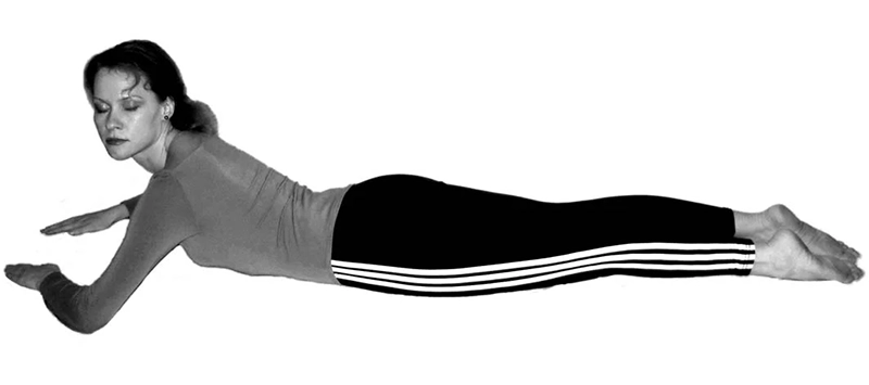 Sarpasana is an ex-ercise joining the effect of both Bhujangasana and pivoting postures. It is en-tered from Bhujangasana by turning the head fol-lowed by shoulders verte-bra per vertebra, from the top down.