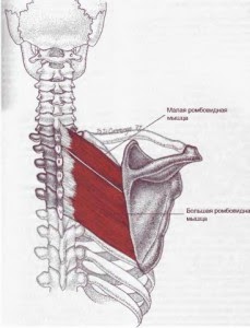 Ромбовидные мышцы также будут находиться в состоянии гипертонуса. Начинаются они от 6го и 7го шейных, 1-4 грудных позвонков.