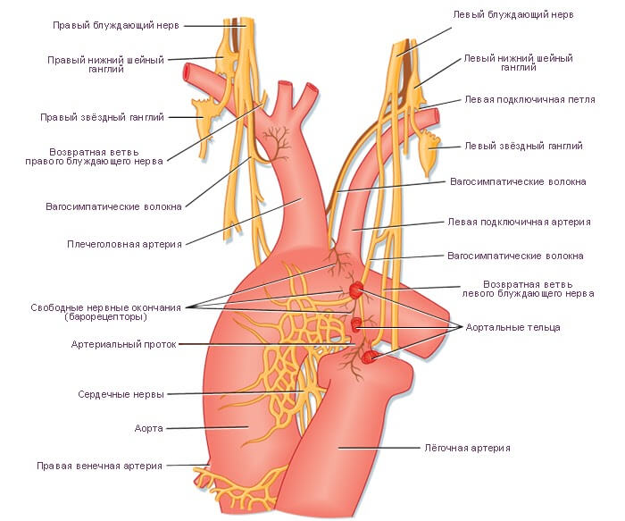 Импульс от них по волокнам языкоглоточного нерва направится в область продолговатого мозга, где после анализа поступившей информации будет сформирован сигнал о необходимости снижения сердечного выброса и частоты сердечных сокращений. Сигнал будет направлен на периферию, к сердцу. Это, в свою очередь, повлечет снижение артериального давления и частоты сердечных сокращений. Данный эффект усилится принудительным удержанием грудной клетки в расширенном состоянии на протяжении всего выдоха (за счет этого мы искусственно поддерживаем отрицательное давление в грудной полости на протяжении достаточно длительного времени).