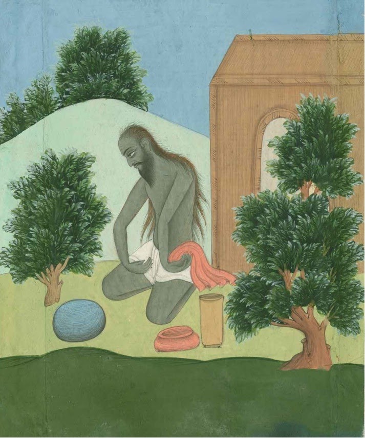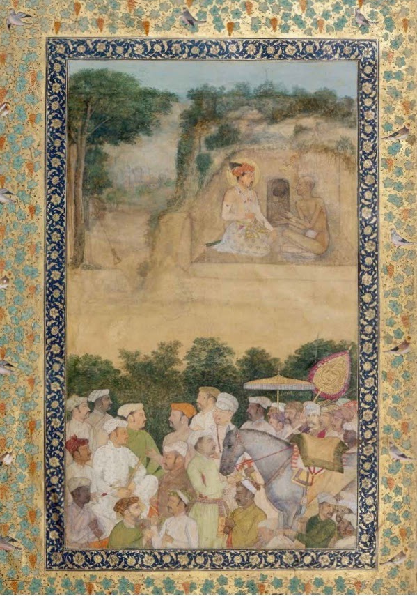 Наряду с таким большим интересом к индийской культуре существовал и более узкий фокус на медитативных и оккультных практиках индийских аскетов и адептов мистицизма, известных как йоги (или джоги в североиндийском варианте произношения). Большей частью такой интерес носил практический характер – из королевских хроник и рассказов путешественников очевидно, что мусульмане были заинтригованы пользой, которую можно найти в чудотворной практике йоги.[3] Это увлечение особенно заметно на примере мусульманских правителей в Южной Азии; как и другие короли, они всегда стремились к особым знаниям или власти (например, астрологии, магии, медицине), которые могли бы дать им преимущества. Так, например, когда североафриканской путешественник XIV века Ибн Баттута был в Дели, он наблюдал, как Султан Мухаммад ибн Туглак ведет беседу с йогом, который c успехом демонстрировал ему свою способность левитировать в воздухе. Подобным же образом император моголов Джахангир регулярно встречался с индуистским аскетом Госаином Джадрупом, как это описано в его мемуарах (рис. 1). Так как рассказы об удивительных возможностях йогов пропитывали популярную индийскую литературу, не удивительно, что мусульмане в Южной Азии были наслышаны об этом и искали более близкого знакомства с подобными знаниями. Справедливости ради стоит отметить, что интерес мусульман к йоге варьировался от поиска философского знания для занятий духовными практиками до простого стремления к оккультным силам. Индийские аскеты были слиты c образом мусульманских факиров или дервишей. Им были присвоены эти персидские названия, и они часто появлялись в иллюстрированных историях моголов, персидских переводах санскритских текстов и сборниках живописи.