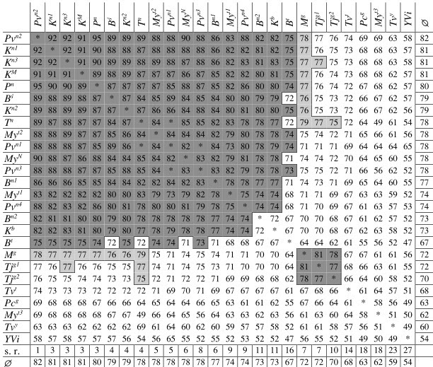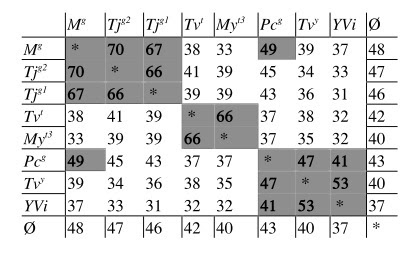 Части таблицы с серой заливкой указывают на группы источников, которые отличаются значительно более высоким процентом общих вариантов чтения. Степень значимости является результатом фиксированного подсчета. В третьей снизу строке, как и в третьем справа столбце, записано среднее процентное значение общих вариантов чтений для каждого источника. Совершенно очевидно, что среднее число получено путем сначала сложения процентного значений общих вариантов чтения для каждого источника, а затем – разделения суммы на количество источников. Например, средним процентным значением для Tjg1 является 72%, для Tjg2 – тоже 72%, в то время как средний показатель общих вариантов чтения для Kn3 составляет 81%. Принадлежность обоих этих источников к одной группе была установлена при помощи факта того, что процентное значение общих между ними вариантов чтения превышает показатель, который можно было бы ожидать, исходя из суммы обоих средних количественных показателей вариантов чтения, разделенных на 2, а именно, средних показателей обоих средних значений. Расчет, который позволяет установить принадлежность к той или иной группе, производится следующим образом: мы складываем среднее процентное значение для двух источников и сумму делим на 2. Результат сравнивается с процентным значением общих вариантов чтения, записанным на пересечении соответствующей строки и столбца. Если число, записанное в этой точке, превышает результат предыдущего подсчета, оба источника принадлежат к одной группе. Если число меньше, то не принадлежат. Здесь снова полезно привести пример. Как мы видим, среднее количество общих вариантов прочтения для Tjg1, как и для Tjg2, составляет 72%. Сумма обоих процентных показателей, разделенная надвое, также равняется 72%. Этот результат является более низким, чем процентный показатель общих вариантов чтения для источников Tjg1 и Tjg2, который составляет 77%. Следовательно, оба источника являются членами общей группы. Обратное верно для отношений между Tjg1 и Bn2. Сумма средних процентных значений общих для двух источников вариантов чтения равна 73% + 72% = 145%, 145, деленное на 2, дает 72.5. А так как процент общих разночтений для Tjg1 и Bn2 – т. е. 70% – ниже цифры из предыдущего подсчета, то эти источники не входят в одну общую группу.