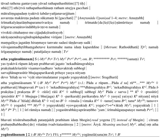 Если же мы сейчас обратимся к анализу передачи первого параграфа PYŚ в том виде, как он приводится в критическом издании (Таблица 3), то первое впечатление может оказаться весьма обескураживающим. Мы видим сутру 1.1 atha yogānuśāsanam, принятую в качестве основного текста, и почти целую страницу вариантов чтения, состоящих из различных мангал (maṅgala – ритуальные начальные строки с приветствием/пожеланием процветания и посвящением текста – прим. пер.) и начальных стихотворных строф – станс арамбхашлока (ārambhaśloka). Однако, если помнить примерную картину с путями передачи, ситуация проясняется.