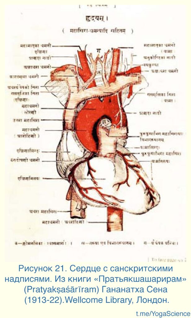 «…Существует семьсот каналов. Тело орошается ими, точно так же, как сад орошается водными каналами, а поле – канавами. И этому помогают специальные сокращения и расширения. Их ответвления похожи на вены листа дерева. Пупок является их корнем. Из него они разрастаются вверх, вниз и горизонтально» (Suśruta Saṃhitā 7.3; Acharya 1915: 293; мой перевод).