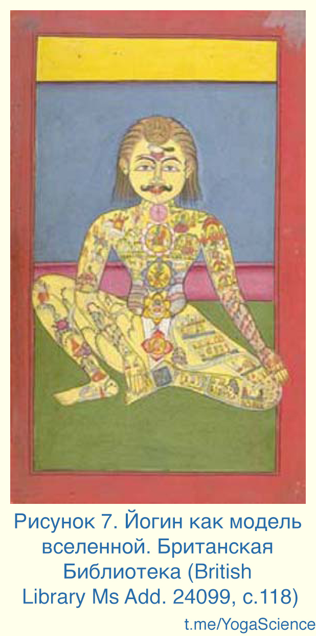 Йогическая модель тела имеет много общего с концепцией тела в тантризме. Базовый текст системы йоги — «Йога Сутра» (Yoga Sūtra) Патанджали (Pataňjali) – не дает много деталей о теле, являясь преимущественно психологическим и духовным текстом. В нем нет даже упоминания о позах – асанах (āsana), которые являются главной особенностью традиции практической йоги. Формализация данных традиций была постепенным процессом, особенно развитие графического представления. В очень небольшом количестве манускриптов показаны йогические асаны (Сджоман (Sjoman), 1996). Тело йогина (yogin) должно быть подчиненным и неподвижным для реализации более высоких состояний медитации и самадхи (Рисунок 6). Контроль дыхания являлся ключевым для достижения неподвижности (Элиаде (Eliade), 1970:55-59). Концепции сопоставления с макрокосмом также есть в данной традиции (см. Рисунок 7).