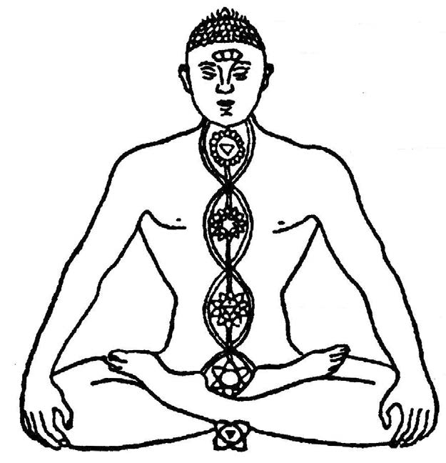 «Зв’язок із внутрішніми органами відбувається двома шляхами. Перший — висхідний і низхідний шляхи білої речовини спинного мозку з його сегментарними апаратами сірої речовини, відділи якого з’єднані між собою за принципом сегментів, що послідовно включаються (Сушумна — примітка А. С.). Другий шлях — через ланцюжок прикордонного симпатичного стовбура вегетативної нервової системи. Симпатичний стовбур простягається збоку від тіл хребців у вигляді низки вузлів, що утворені скупченнями нервових клітин; ці вузли з’єднані між собою в обох напрямках провідниками. Симпатичний стовбур — парне утворення. Як показали дослідження останнього часу (Огнєв та його школа), права та ліва частини стовбура не рівнозначні (Пінгала та Іда — примітка А. С.¹), як вважалося донедавна; правий та лівий стовбури виконують близькі, але не тотожні функції: лівий стовбур відповідає за артеріальні судинорухові рефлексами, а правий — за венозні. Обидва стовбури утворюють посегментарно більш-менш потужні сплетення (які саме й відповідають чакрам — примітка А.С.), на кшталт місцевих центрів управління, і все ж таки вони об’єднані в одну супідрядну систему. Знизу догори порядок сплетень такий: