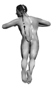 У пашчимоттанасані слід набирати енергію під час нахилу, коли видихаємо повітря, й одразу вести у задньосерединний меридіан.