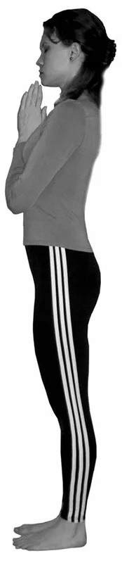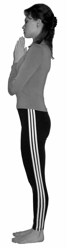 Стати прямо, ступні разом, обличчям до сонця або у напрямку сонця. З’єднати долоні перед грудьми в положенні анджалі-мудри. Закрити очі й розслабити все тіло. Концентруватися на відчуттях у ньому принаймні пів хвилини. Це підготує вас до практики. Спробуйте (саме) свідомо розслабити м’язи тіла. Подих: зробити декілька повних йоґівських подихів.