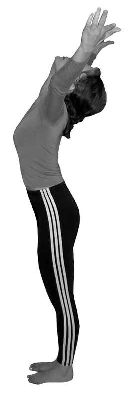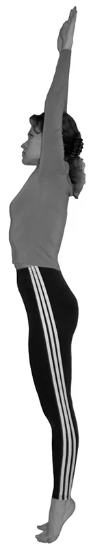 Вдихаючи повітря, піднести обидві руки над головою, одночасно піднімаючись навшпиньки. У кінцевому положенні руки випрямлені в ліктях та паралельні між собою; долоні повернені вперед. Продовжувати ритмічне дихання.