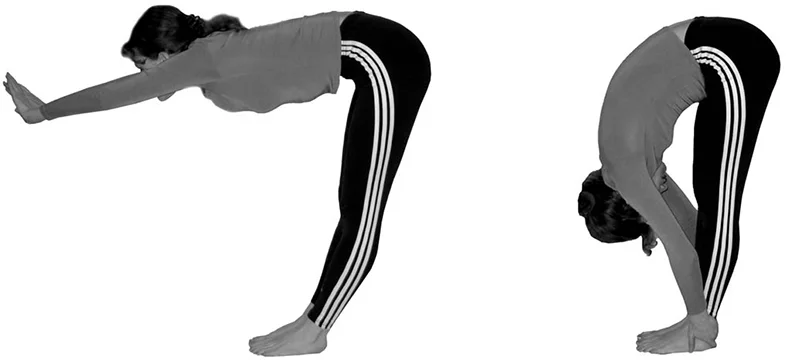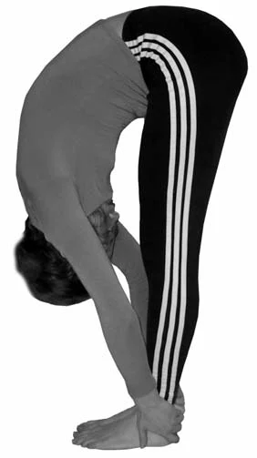 Видихаючи, повільно опуститися на всю стопу, нахилитися вперед та покласти долоні на підлогу перед ступнями, або обхопити ноги руками. Рух тіла має бути безперервним та без будь-яких ривків. Прогин здійснювати, починаючи від нижніх хребців до верхніх, як у пашчимоттанасані. Ноги тримати прямими. Якщо можливо, спробуйте торкнутися колін чолом або підборіддям. Продовжуйте ритмічне дихання.