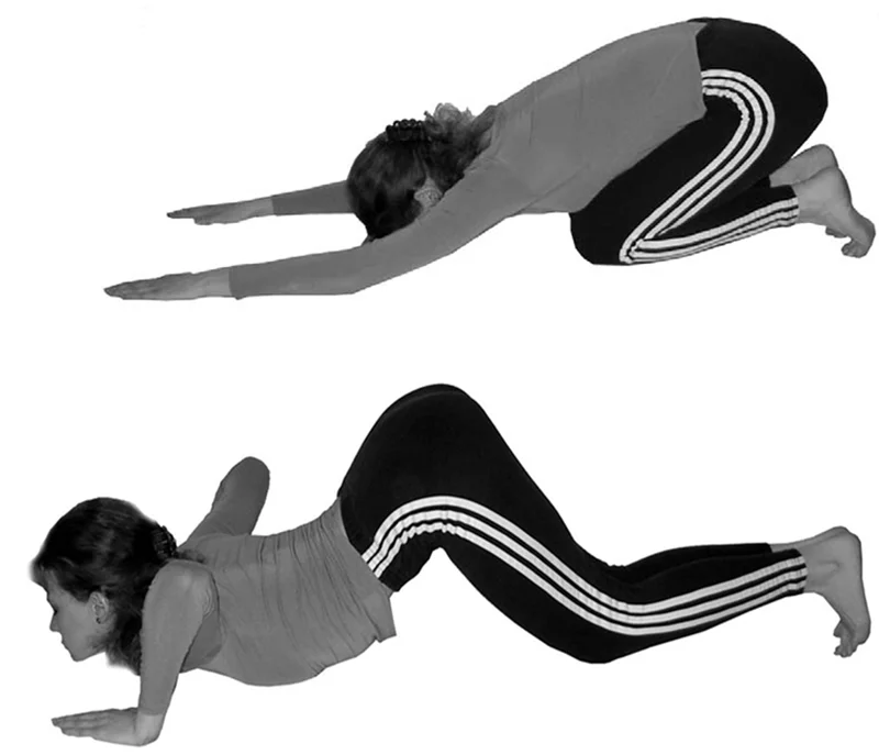 Видихаючи, потрібно прийняти положення «рачки» і, продовжуючи видихати, зиґзаґоподібно сковзнути чолом по підлозі під час руху голови й тулуба вперед. Наприкінці цього руху дозвольте грудям просковзнути по підлозі й покладіть підборіддя. У кінцевому положенні на підлозі повинні бути вісім точок: підборіддя, груди, обидві долоні, обидва коліна й пальці обох ніг.