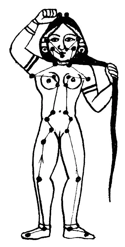 Рух енергетичного «припливу» всередині організму протягом 28-денного місячного циклу зображений на малюнку. Класичні індійські трактати не уточнюють, чи відрізняється цей рух для чоловіків та жінок, однак ми вважаємо, що так — відрізняється і є дзеркальним. У чоловіків на молодий місяць точка максимального впливу місяця перебуває, відповідно, на лівій нозі, у жінок — на правій, потім до повного місяця вона йде лівою (для чоловіків) та правою (для жінок) половиною тіла. На місяць у повні вона перебуває в голові. І на другу фазу місяця, — вона спадає, відповідно, у чоловіків до правої, у жінок — до лівої ноги.